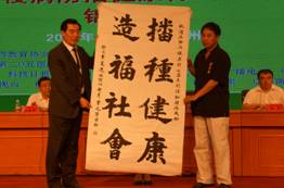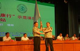 启动仪式上中国医药教育协会领导向“慢病防治工≌”站长黄晓文院长授牌、颁发证书、赠送健康教育一体机,并向社区群众代表赠送安全用药系列丛书。下一站将于2013年8月份在哈尔滨武警黄金总队医院召开,该院陈开安院长从205医院黄晓文院长手中接过大旗,并代表武警黄金医院全体官兵、职工发表接旗感言,表示一定以解放军205医院为榜样,虚心学习他们的优良传统,学习协会经验,在协会领导的指导帮助下、把健康行活动承办和开展好,更好的惠及百姓,服务社会。此外,书法家马云峰先生为中国医药教育协会赠送墨宝;与会代表与参会领导合影。